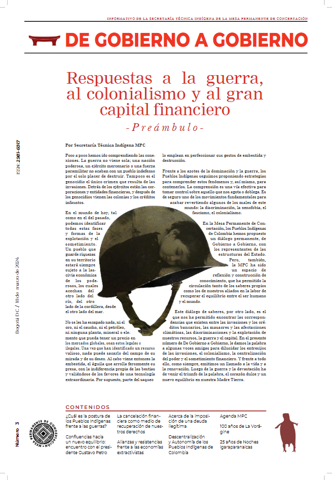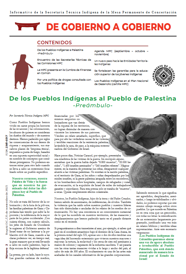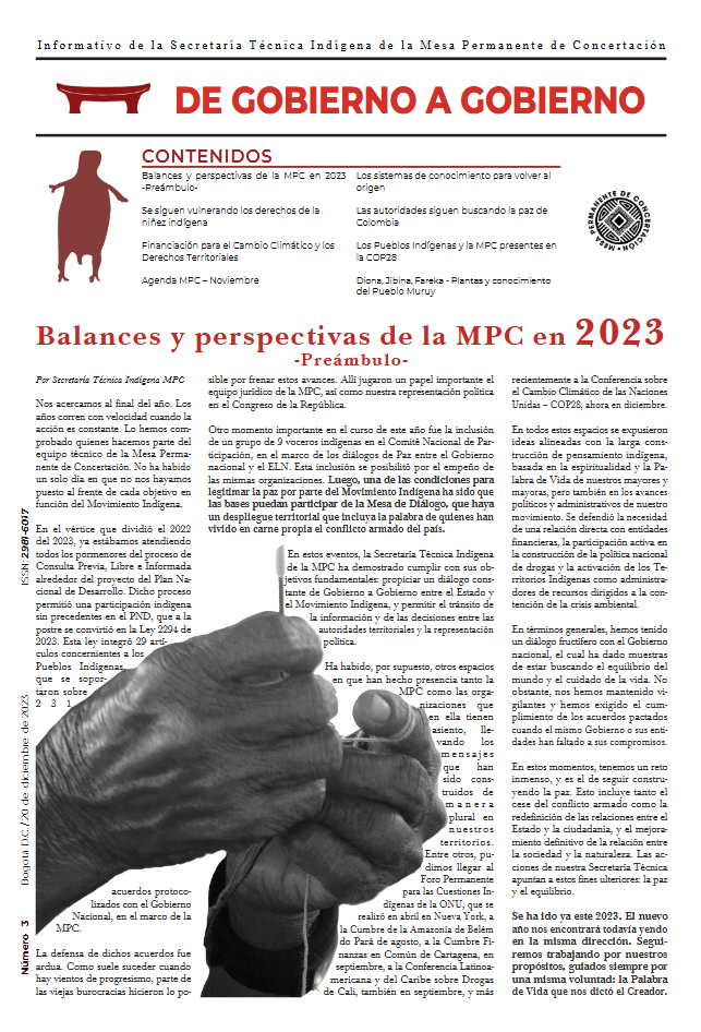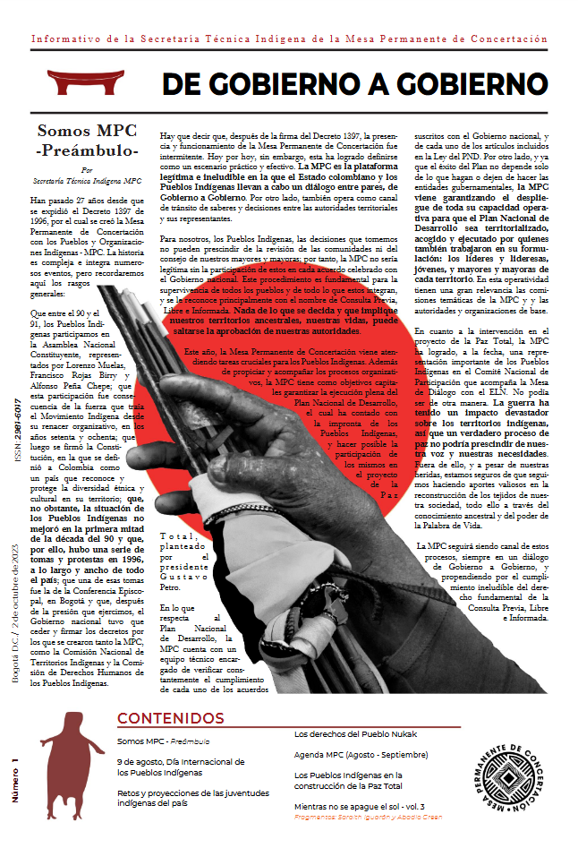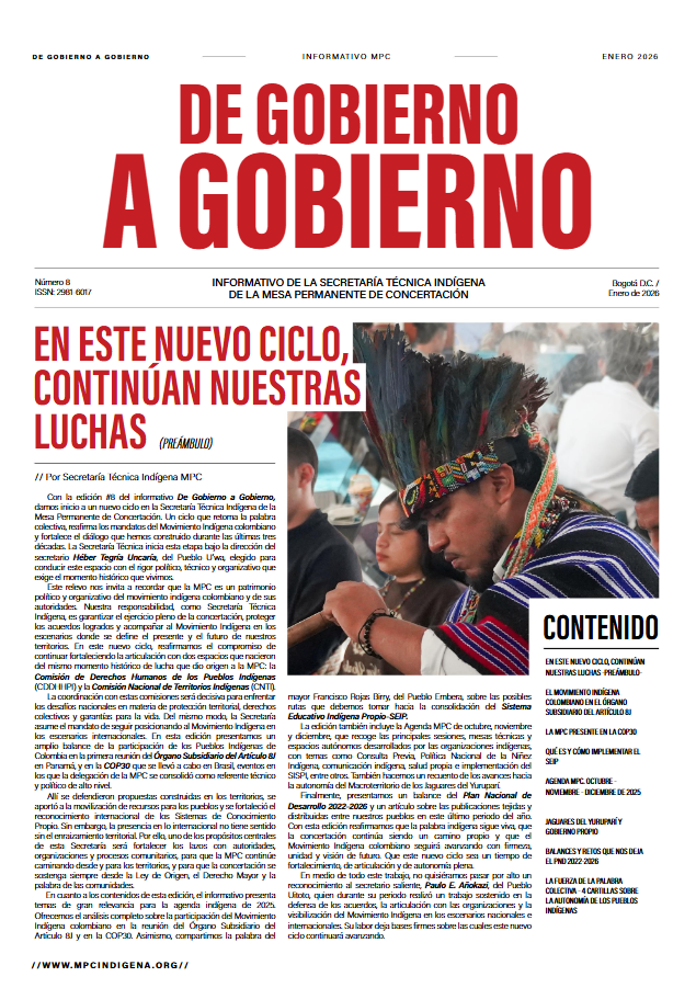 Es el espacio periodístico de la Mesa Permanente de Concertación (MPC) donde abrimos la comunicación a todos los Pueblos indígenas y a la sociedad en general. Aquí encontrarás información, análisis y relatos sobre las decisiones, políticas y procesos de concertación entre el Gobierno nacional y los Pueblos Indígenas. Este periódico editorial busca visibilizar las luchas, avances y estrategias que impactan la vida de nuestras comunidades, promoviendo la transparencia, la participación y el diálogo constante.